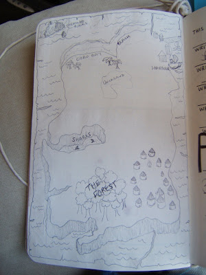 On this page (above), I drew a treasure map. I used to draw them all the time as a child. Looking back at them, I loved how everything would be completely out of proportion (a house the same size as a tree, etc). So here's that page. I encourage doodling! Forget about trying to make it look good, just draw the way you did as a child - when it was just for fun. Ahh those were the days, eh?